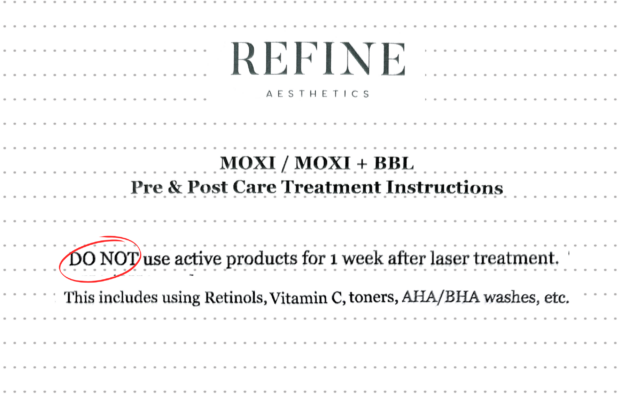 Let me share a story. Last year, I had my first ever laser skin treatment (the Moxi laser). At the end of the service, I was given post-care instructions on how to take care of my skin at home to ensure I am not using anything that may impede the healing process.